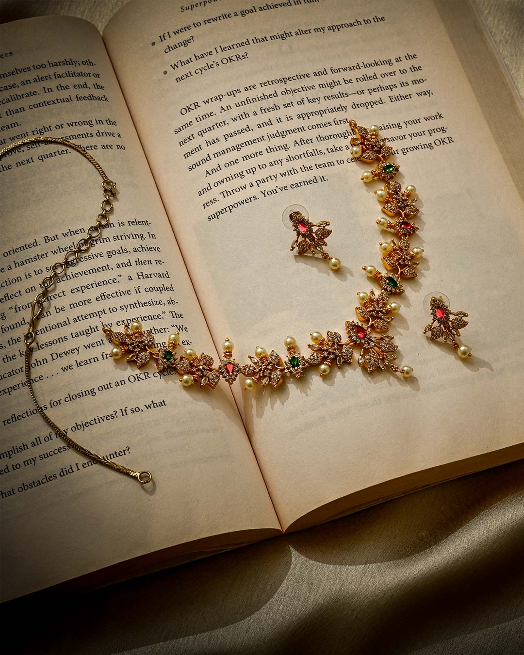 Inspired by royal garden aesthetics, our Antique Gold Floral Necklace Set is crafted to bring timeless beauty to your jewellery collection. The necklace is adorned with detailed floral patterns, each petal encrusted with sparkling cubic zirconia stones in shades of pink, green, and white.