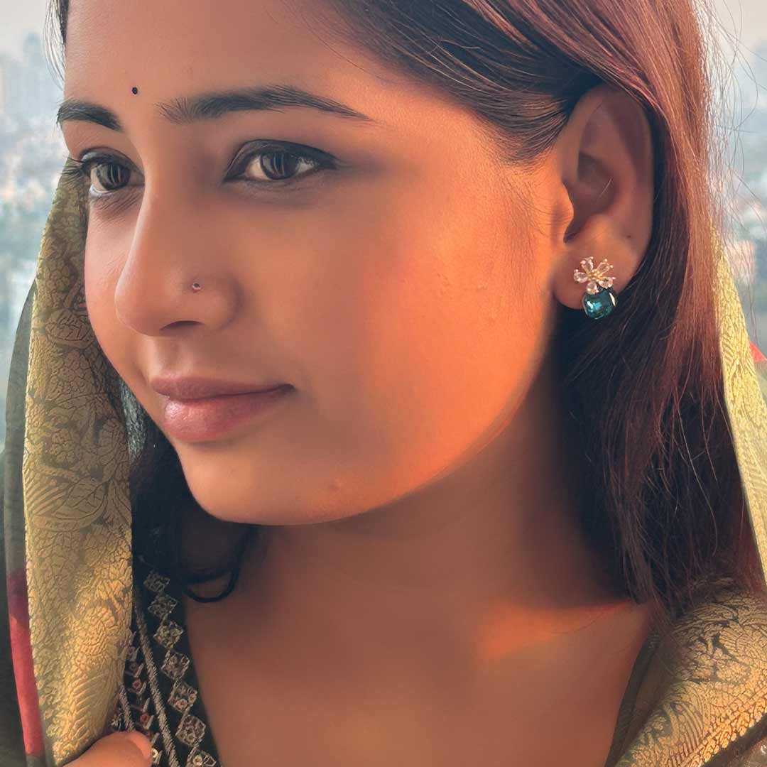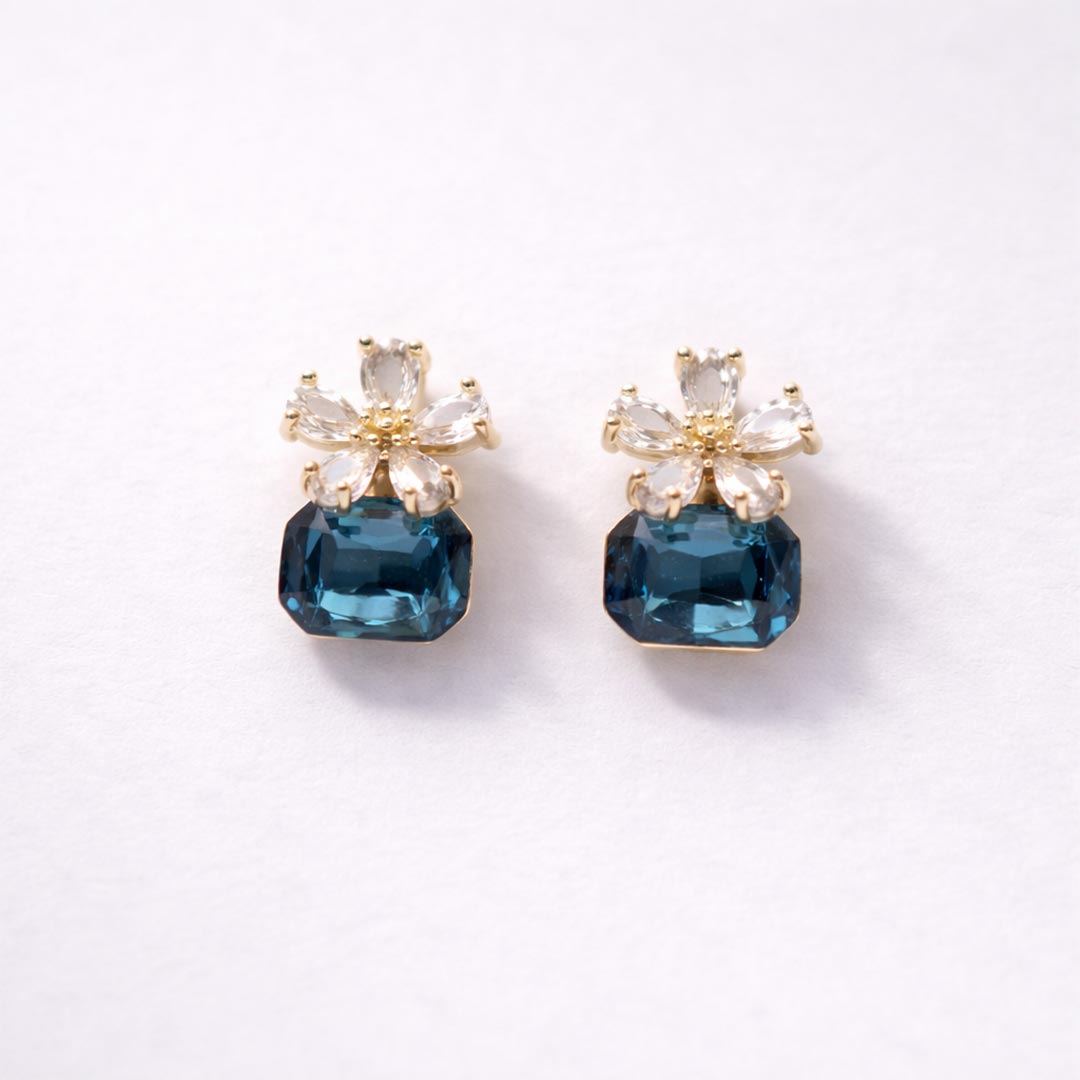 These Blue Crystal Flower Stud Earrings feature a radiant blue crystal paired with a delicate floral top, crafted in gold-plated stainless steel with an anti-tarnish finish. Minimal, elegant, and ideal for everyday to party wear.