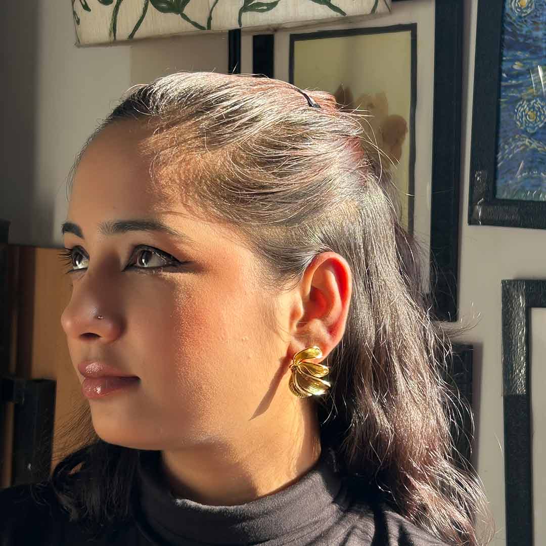 Inspired by modern Korean fashion aesthetics, these Gold Plated Leaf Earrings are designed for women who love clean lines and subtle statement jewellery. The layered leaf-like form creates a fluid, sculptural look that feels both artistic and refined. Finished with a premium anti-tarnish gold plating, these earrings maintain their shine while being lightweight and comfortable for all-day wear. Their minimal yet distinctive design makes them a versatile accessory that pairs beautifully with western outfits, office wear, and soft ethnic looks. Perfect for daily styling, casual outings, brunches, or gifting, these earrings bring understated luxury to your jewellery collection.