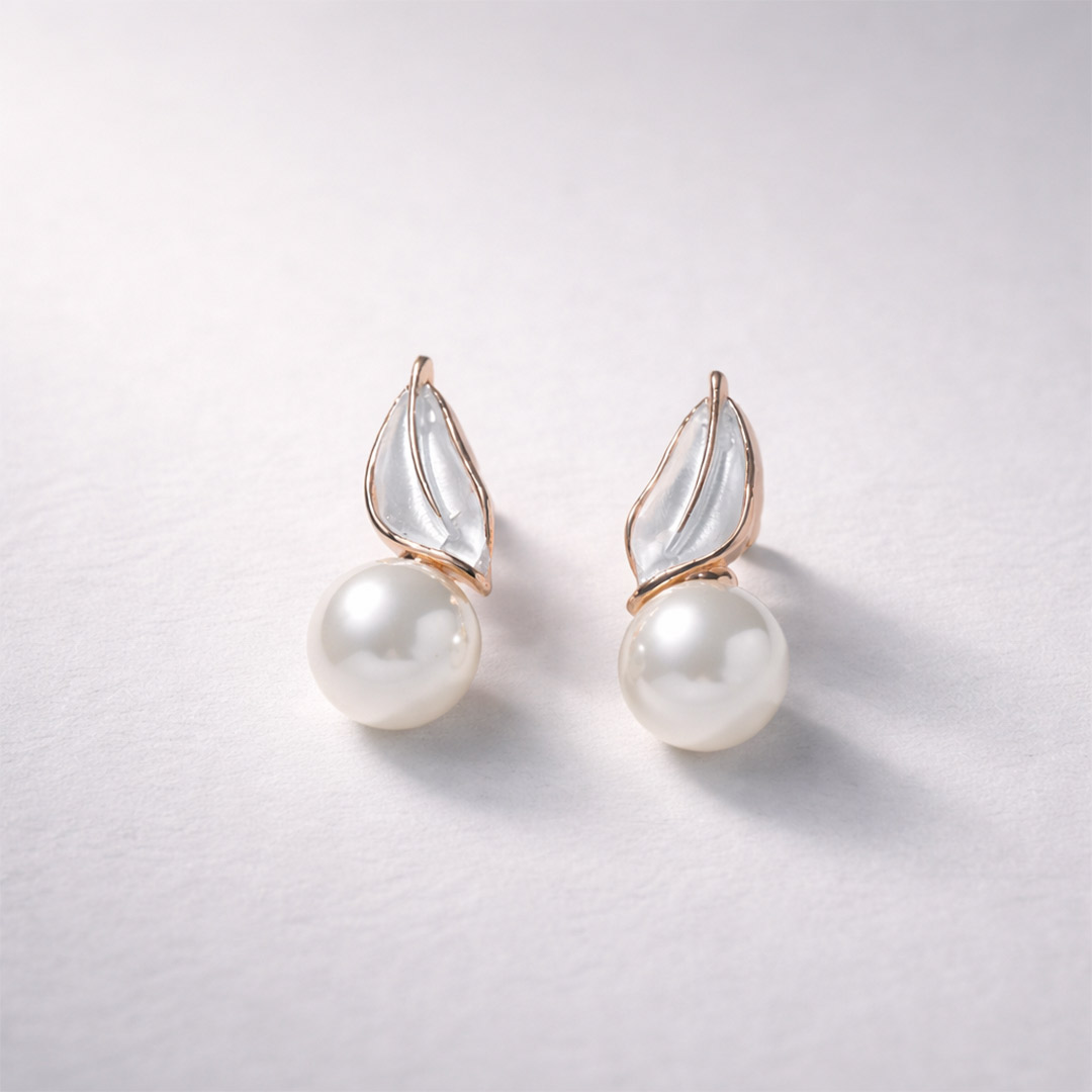 Celebrate understated luxury with our Leaf Motif Pearl Drop Stud Earrings in Rose Gold Tone. Designed with a sleek, modern leaf silhouette and finished with a luminous pearl drop, these earrings strike the perfect balance between contemporary style and classic charm.
