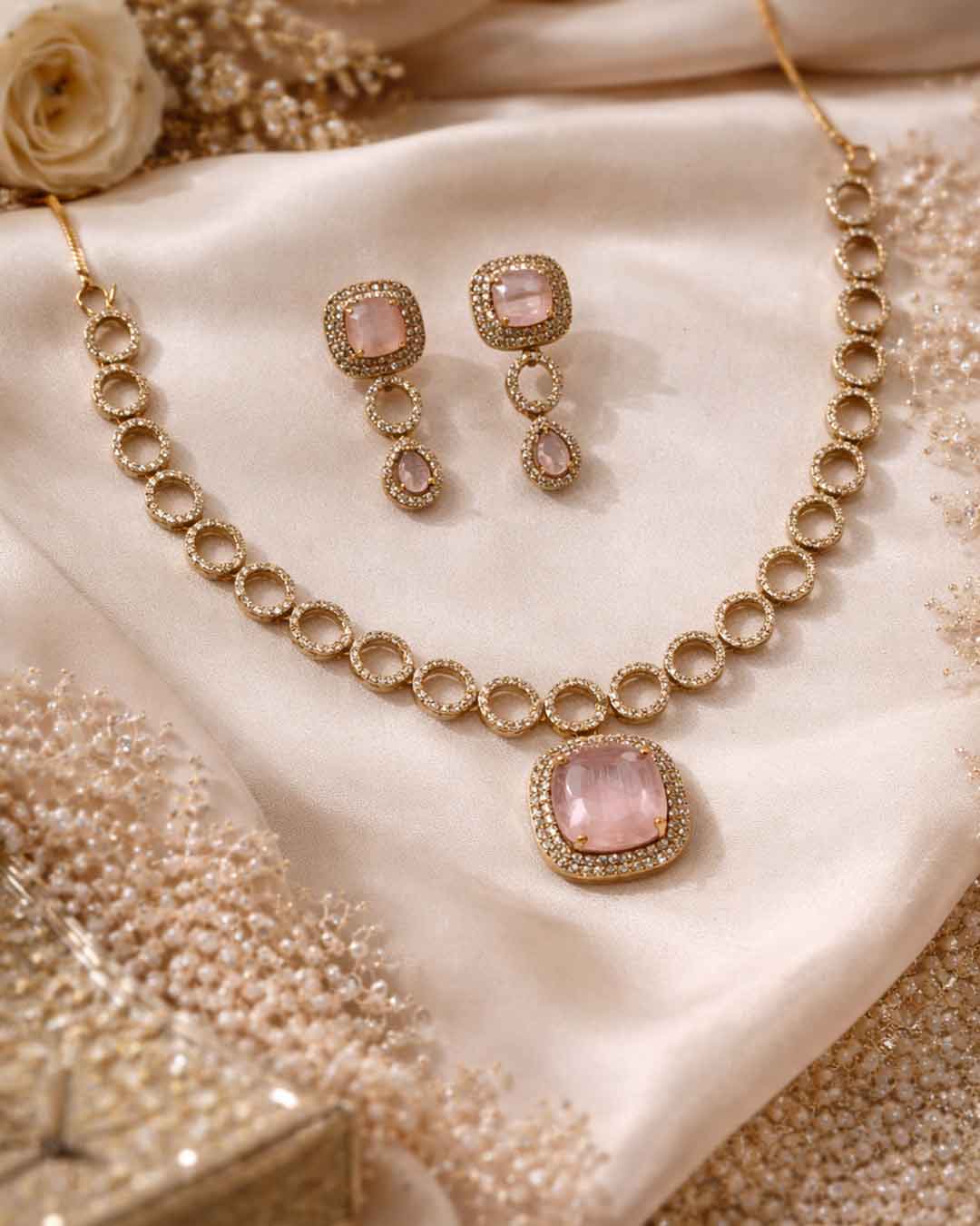 Refined and graceful, our Rose Quartz Pink Stone Necklace Set is designed for those who love understated luxury. The necklace features a series of delicate gold-toned circular links, leading to a statement pendant set with a soft pink stone that radiates subtle elegance.